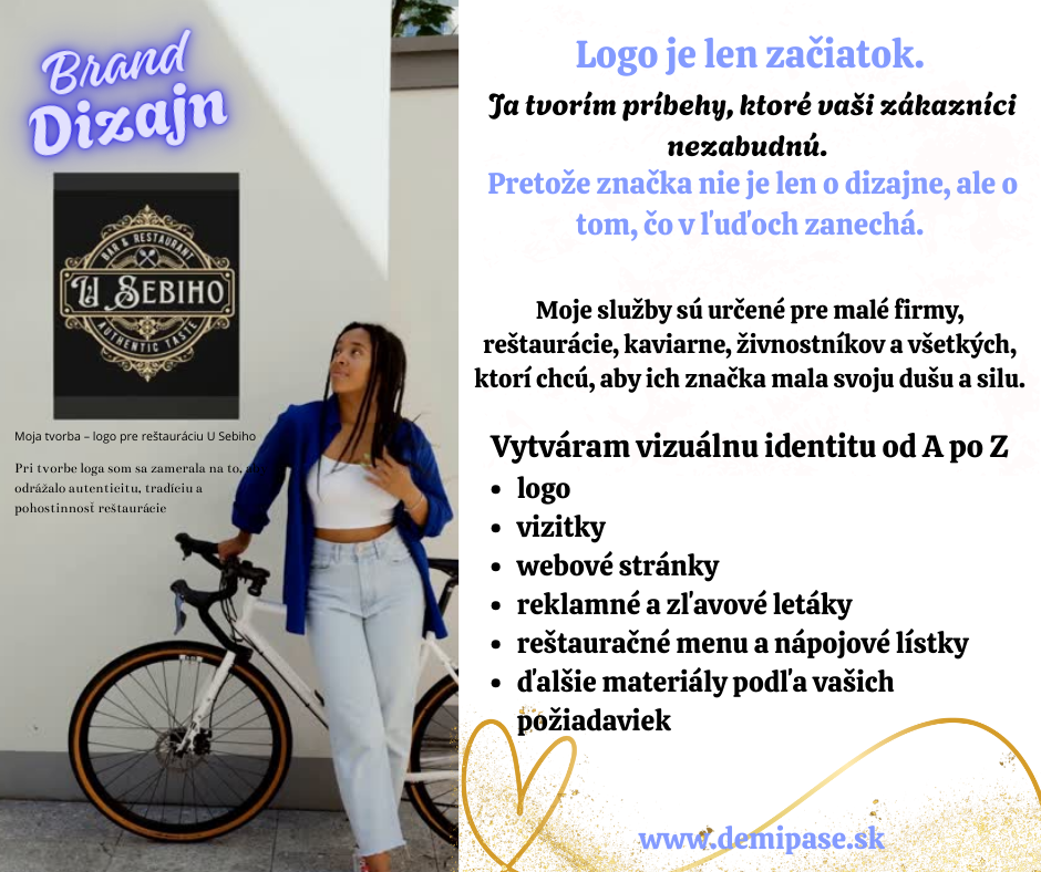Sme firma, ktorá sa so svojím tímom okrem brand dizajnu venuje aj ďalším marketingovým činnostiam. Čo sa týka brandu, budem sa vám venovať osobne ja – Denisa, brand dizajnérka s dušou. V dizajne spájam estetiku s funkčnosťou a verím, že každá značka si zaslúži príbeh, ktorý sa dá cítiť. Mám skúsenosti z gastro sveta aj z malých firiem, a preto viem, čo podnikateľov trápi a čo im môže pomôcť. Ku každému projektu pristupujem individuálne, s trpezlivosťou a férovosťou.